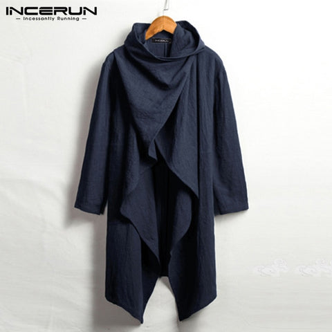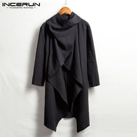 INCERUN Men Coats Long Sleeve Scarf Collar Trench Ponchos Cotton Outwear Solid Cloak Vintage Irregular Jackets Men Streetwear 7